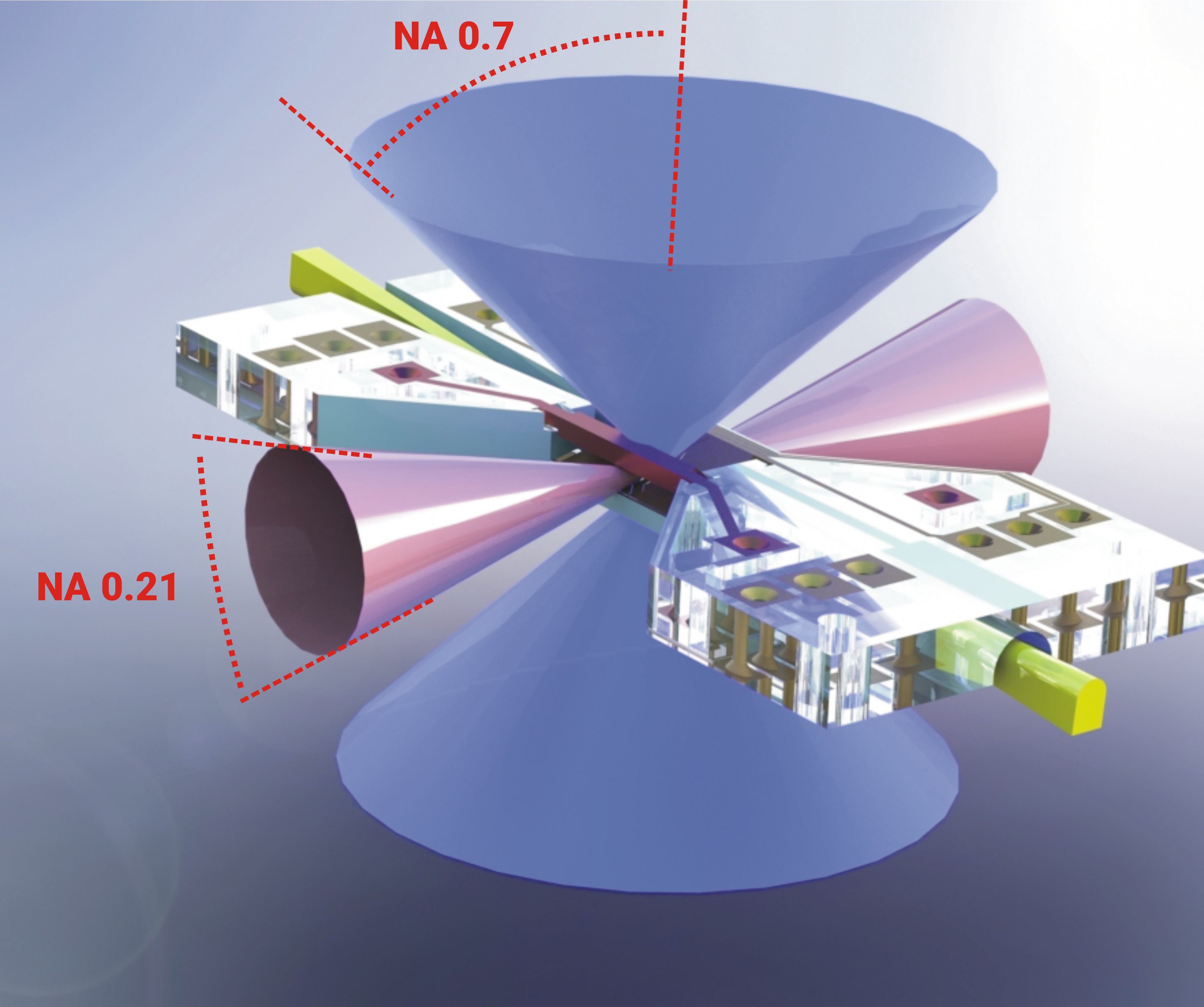 The blades are inclined to provide a bi-directional solid angle of 0.21 NA in the main plane, and 0.7 NA along the z axis from the trap center, enabling multi-directional individual-ion addressing and high photon collection efficiency.